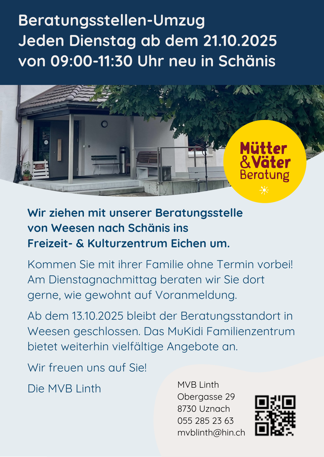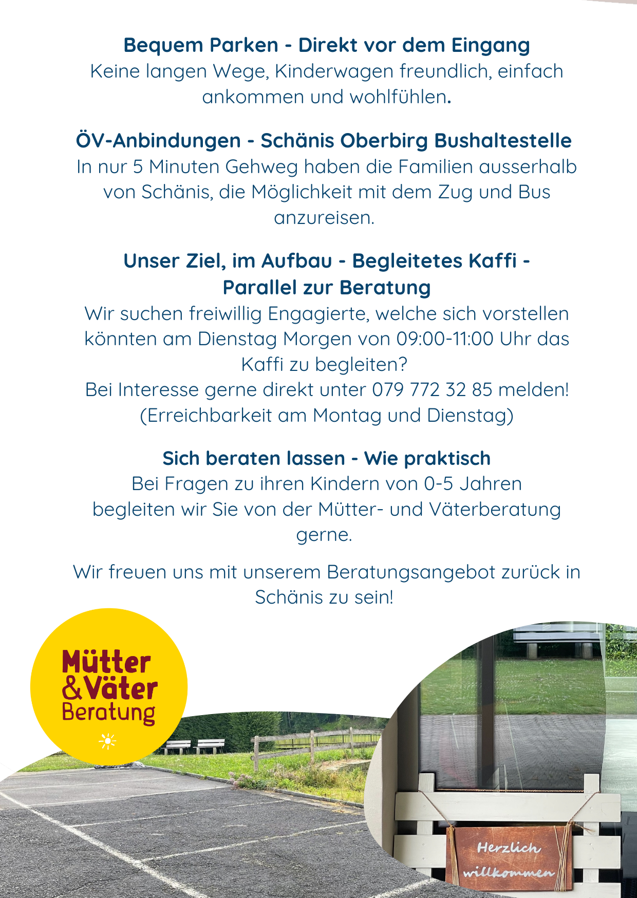 Ab dem 21.10.2025 ist die Mütter & Väterberatung jeden Dienstag im Eichen. Gesucht werden noch Freiwillige, welche sich vorstellen könnten, am Dienstag Morgen das Kaffi zu begleiten ?