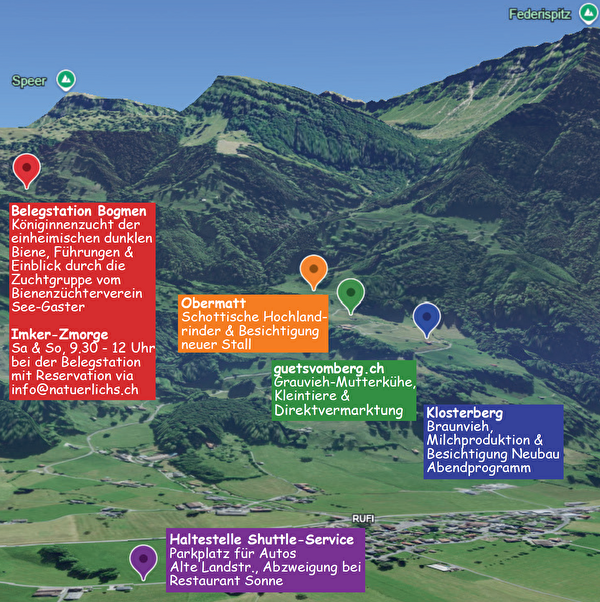 Passend zum Motto «Ohne Landwirtschaft keine Bienen. Ohne Bienen keine Landwirtschaft» wirken am Jubiläumsevent drei Landwirtschaftsbetriebe auf dem Weg zur Bogmen mit. Neben der Bienenbelegstation Bogmen, geführt von der Zuchtgruppe Bogmen, des Bienenzüchtervereins See-Gaster, sind auch die Höfe Obermatt, Untermatt und Klosterberg oberhalb vom Dorf Rufi SG Gastgeber der nächsten Linth-Tour vom 2. & 3. Mai 2026.